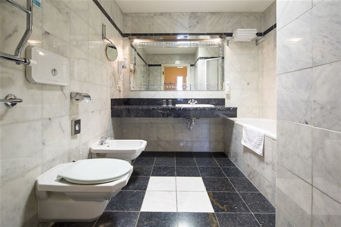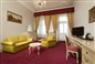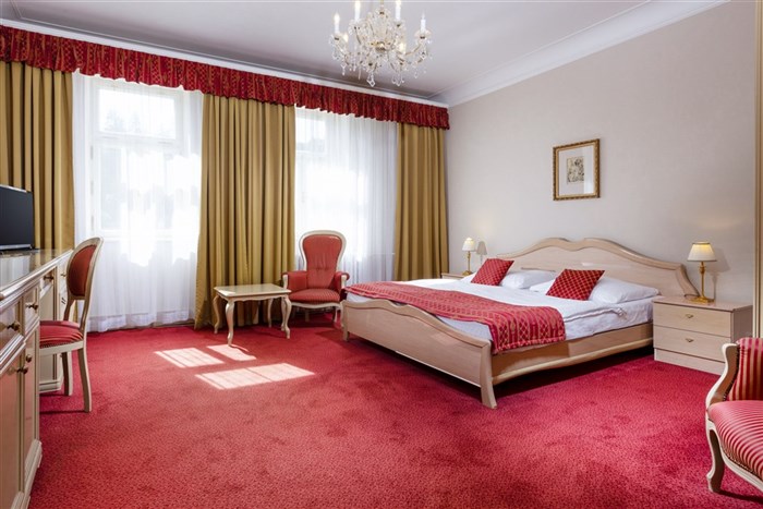 “Deluxe” rooms have balconies and offer a magnificent view of the Colonnade with the singing fountain. They are equipped with satellite LCD TV, fridge, telephone and safe. The bathroom has a shower, or shower bathtub, and hairdryer. In-room coffee and tea sets are supplied and mineral water is also available upon arrival. In addition, you can enjoy free entry to the relaxation pool from 9.00 – 11.30 and 12.30 – 20.30. For your visit to the pool, a bathrobe, slippers, towels and sheets are available at no charge.